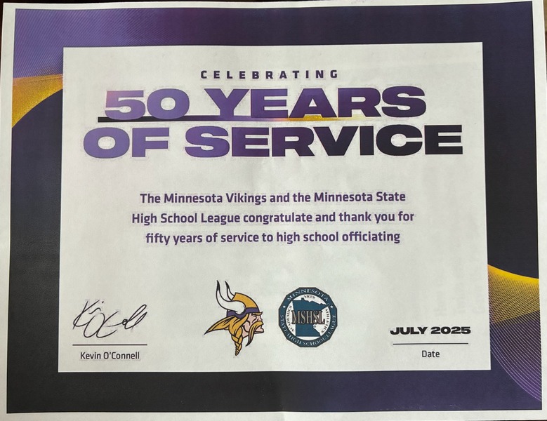 This year, Cook was awarded a wrist watch by the League for 50 years of service. In September, there was another surprise, as the Minnesota Vikings and MSHSL co-sponsored an award (certificate) to nine persons to highlight a career spanning five decades as sports officials.