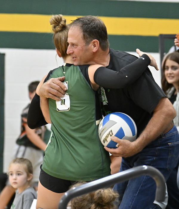 Josie receives a big hug from her dad as she hands him the milestone ball.