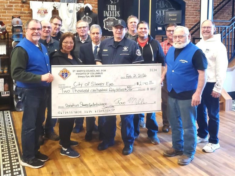 The Sleepy Eye Knights of Columbus Council presented a check for $2,140 to the Sleepy Eye Ambulance Crew. Gary Lambrecht and Gloria Nachreiner accepted the check on behalf of the ambulance crew. The money was raised through the KCs annual Benefit Brunch. The Sleepy Eye Ambulance Crew plans to use the proceeds to purchase a full-body vacuum splint.