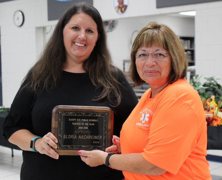 The Sleepy Eye Education Association honored Sleepy Eye High School social studies teacher Gloria Nachreiner as their 2018-2019 Teacher of the Year. Above SEEA president Mindy Berkner presents Gloria the award.
