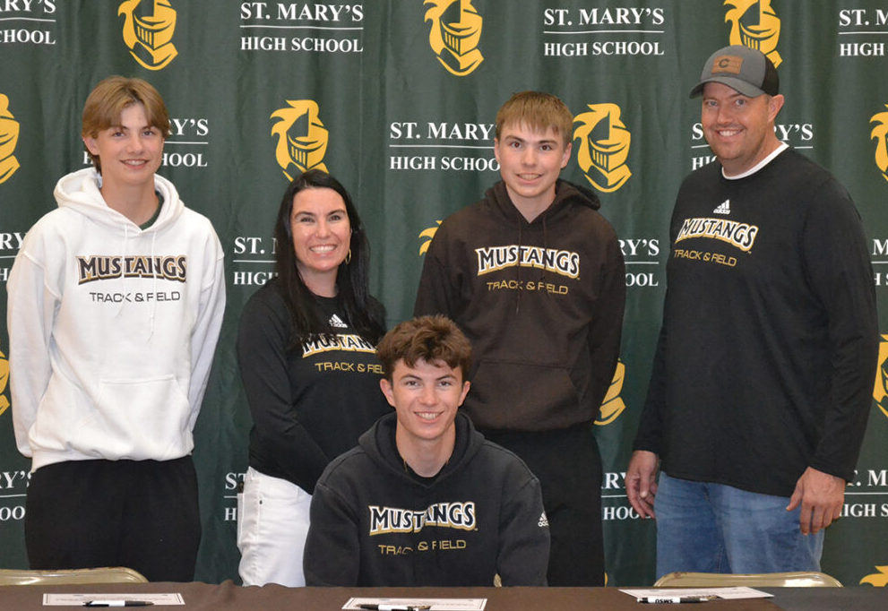 Sleepy Eye St. Marys’ Noah Christensen poses for a photo after signing his Letter of Intent to continue his cross-country and track and field career in college at Southwest Minnesota State University. Pictured with Noah are his mom Ann, dad Mark, and his brothers Eli and Isaac.