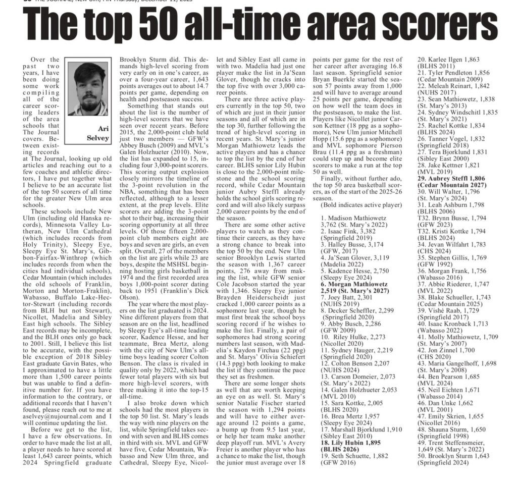 Home/Sports/Sleepy Eye Varsity Sports/Sleepy Eye Boys Basketball/NU Journal: Several Sleepy Eye hoopsters rank in top 50 scoring Sleepy Eye Boys BasketballSleepy Eye Girls BasketballSt. Mary's Boys BasketballSt. Mary's Girls Basketball NU Journal: Several Sleepy Eye hoopsters rank in top 50 scoring Facebook X Print