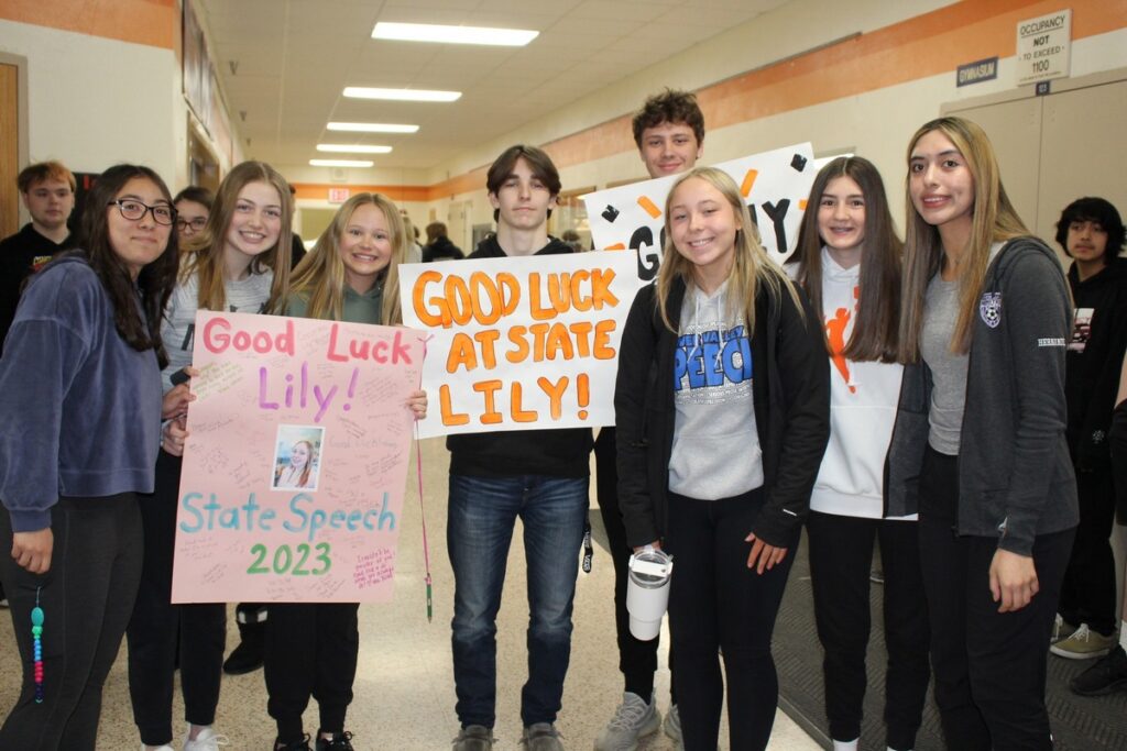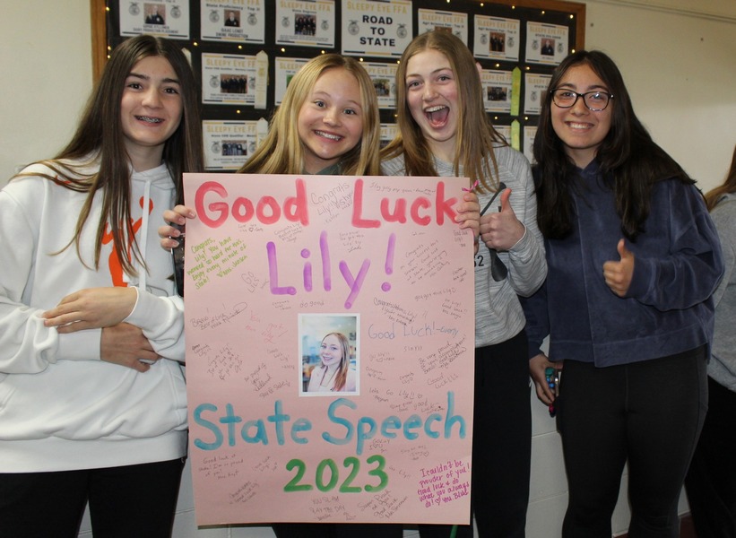 Sleepy Eye High School sophomore Lily Kallevig earned third place for extemporaneous reading at the section competition to earn a trip to state. The MSHSL Class A State Speech tournament will be held on Saturday, April 29 at Eastview High School in Apple Valley. Sleepy Eye High School gave Lily a rousing send off.