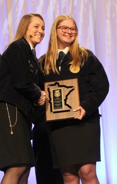 Emily Matejka, State FFA President, (left) presented Sophie Kyllonen (right) with her State Finalist plaque for Star in Ag. Production Placement.