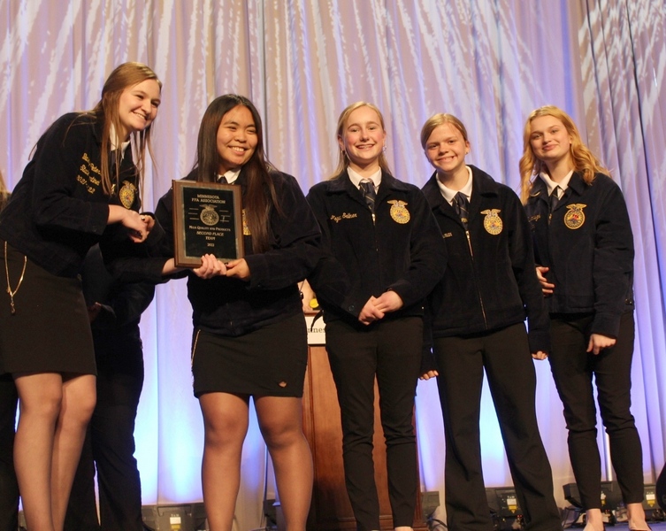 Baleigh Peterson (left), State FFA Sentinel, awarded the 2nd place Milk Quality Team plaque to the Sleepy Eye FFA Chapter. Team members include: Katelyn Capacia, Megan Sellner, Jace Schauman, and Rylee Jennissen.