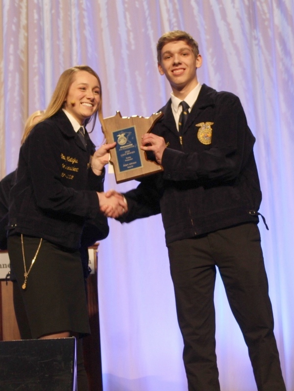 Kyle Thomas, State FFA Treasurer, presented Morgan Hoffmann with the 1st place award for the State FFA Ag. Communications Proficiency.