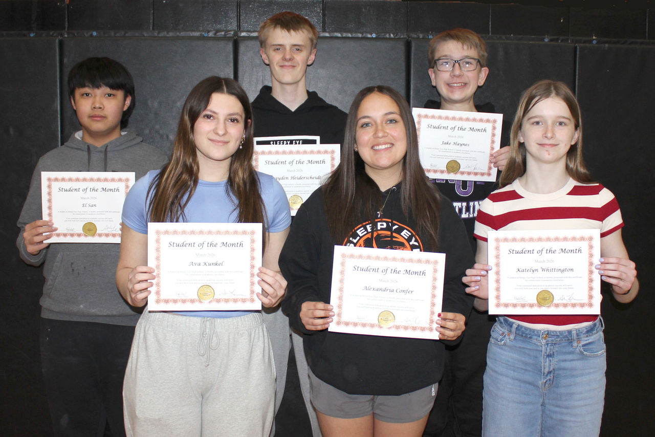 Home/School Bag/Sleepy Eye High School March Students of Month School Bag Sleepy Eye High School March Students of Month Sleepy Eye High School March Students of the Month (from left): El San, Ava Kunkel, Brayden Heiderscheidt, Alexandria Confer, Jake Haynes and Katelyn Whittington. Facebook X Print
