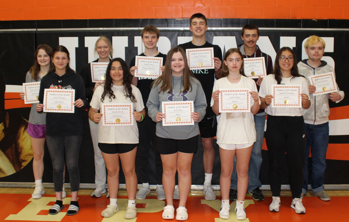 The Sleepy Eye High School May Students of the Month: Front row, from left: Amy Van Bragt 12th grade – Agriculture, Marely Davila 8th grade – Mathematics, Ava Sellner 8th grade – Music, Sophia Helget 7th grade – English, Yanellie Fernandez 10th grade – Health. Back row: Destiney Dittbenner 9th grade – World Languages, Sophia Gustafson 12th grade – Social Studies, Hunter Mertz 9th grade – Physical Education, Landon Wendinger 10th grade – Science, Jacob Price 12th grade – Art, Dennis Anderson 11th grade – Career Exploration.